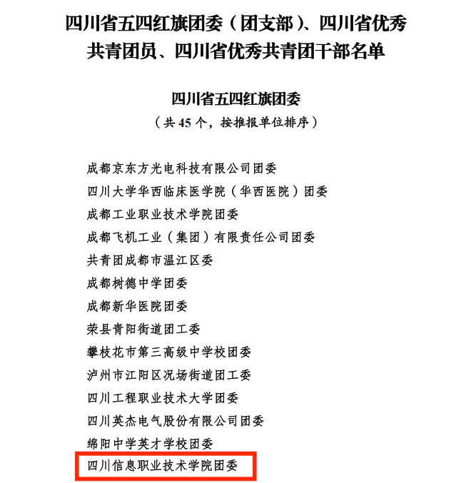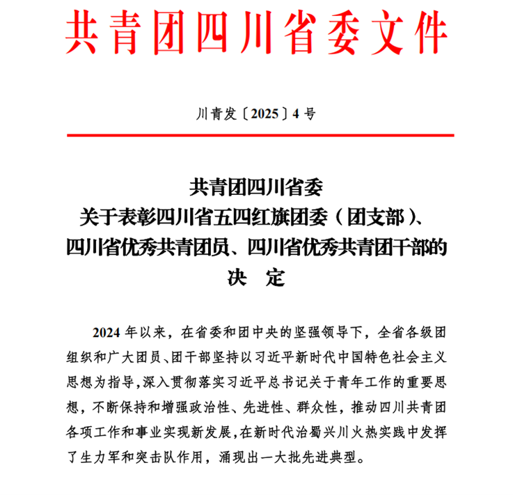 近期,共青团四川省委公布了2025年四川省五四红旗团委(团支部)、四川省优秀共青团员、四川省优秀共青团干部名单。学院团委因工作出色,被授予“四川省五四红旗团委”荣誉称号。