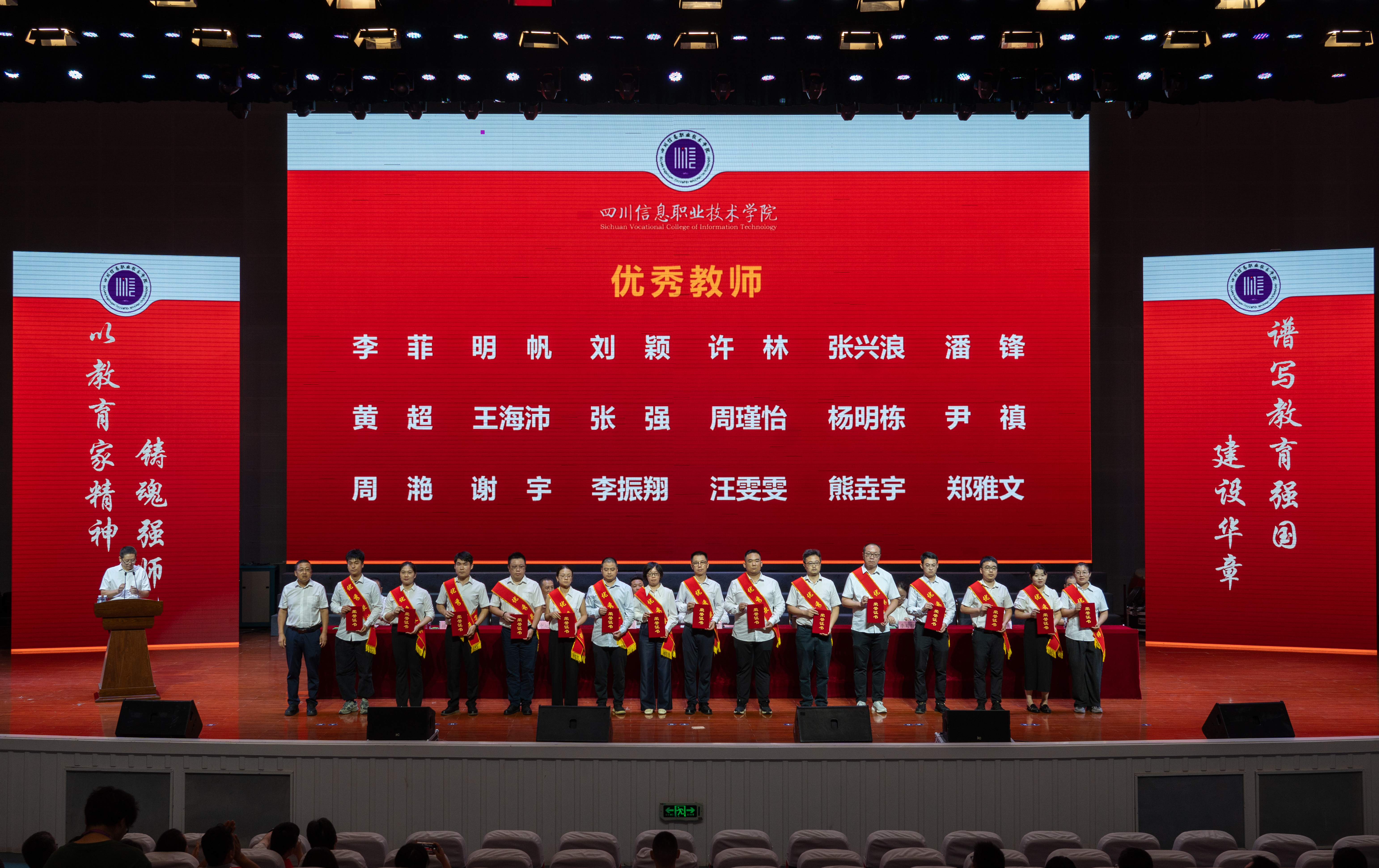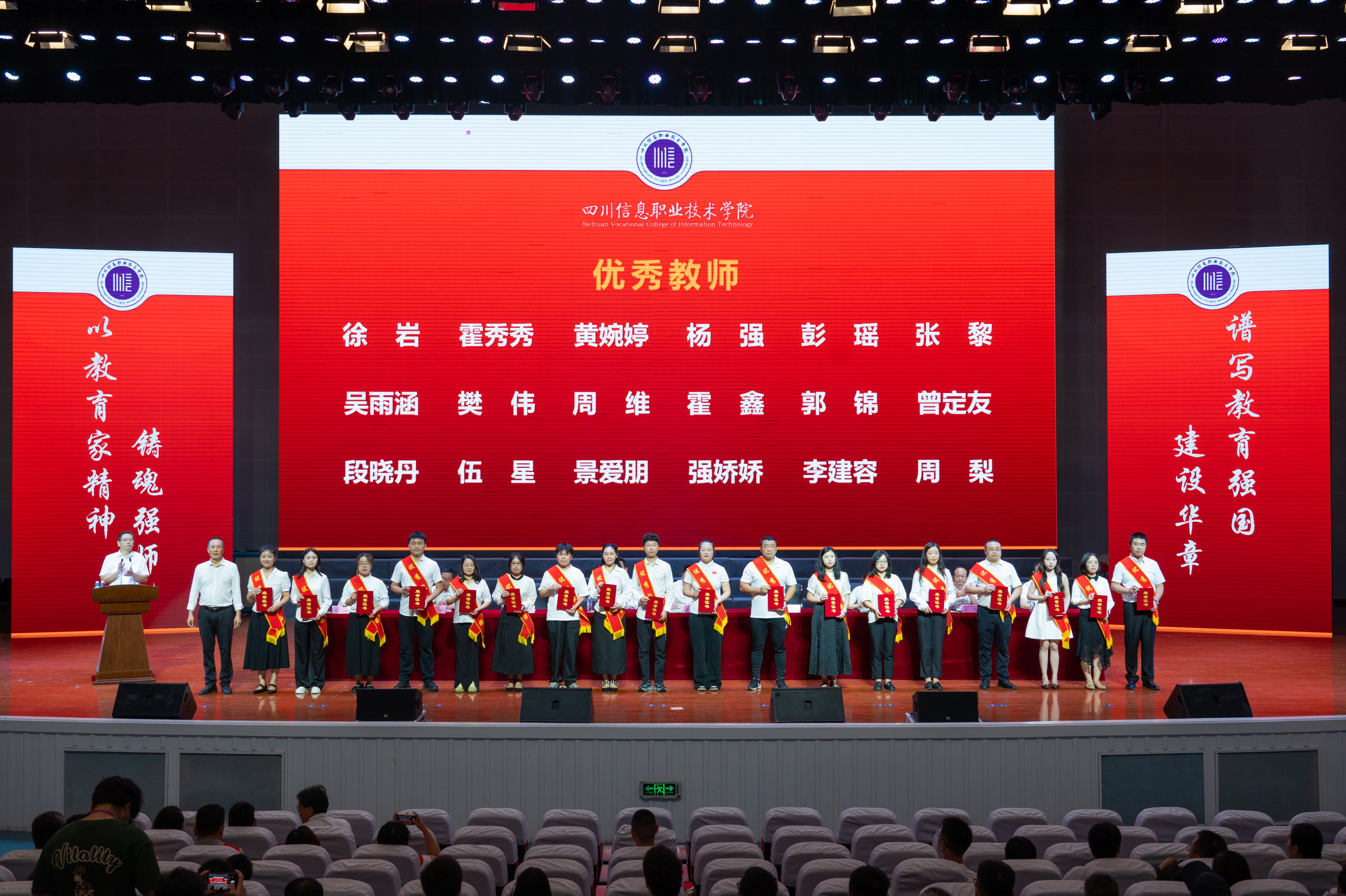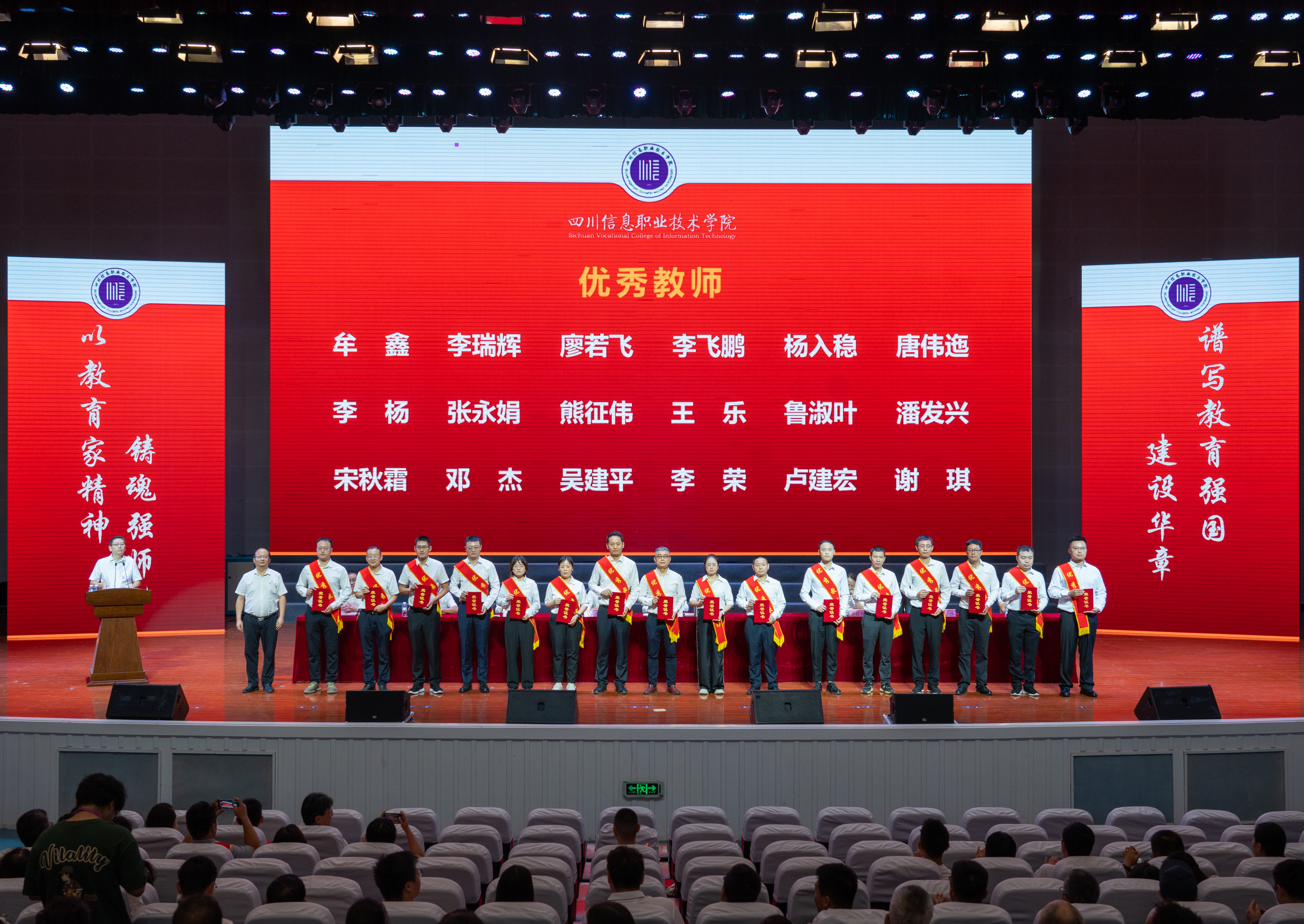 会上,韩鹏宣读了四川省经济和信息化厅教师节慰问信,党委副书记刘凯宣读了2025年教师节表彰文件;与会领导分别为获得2024-2025学年优秀教师、优秀辅导员、管理服务育人先进个人、师德师风先进个人、省级教学创新团队主持人、省级名思政课教师工作室主持人、省级名辅导员工作室主持人、竞赛国家级奖项优秀指导教师、光荣从教三十年教师等荣誉称号的教职员工代表颁发了荣誉证书,优秀教师代表孙红霞分享了教育教学工作中的收获与心得。