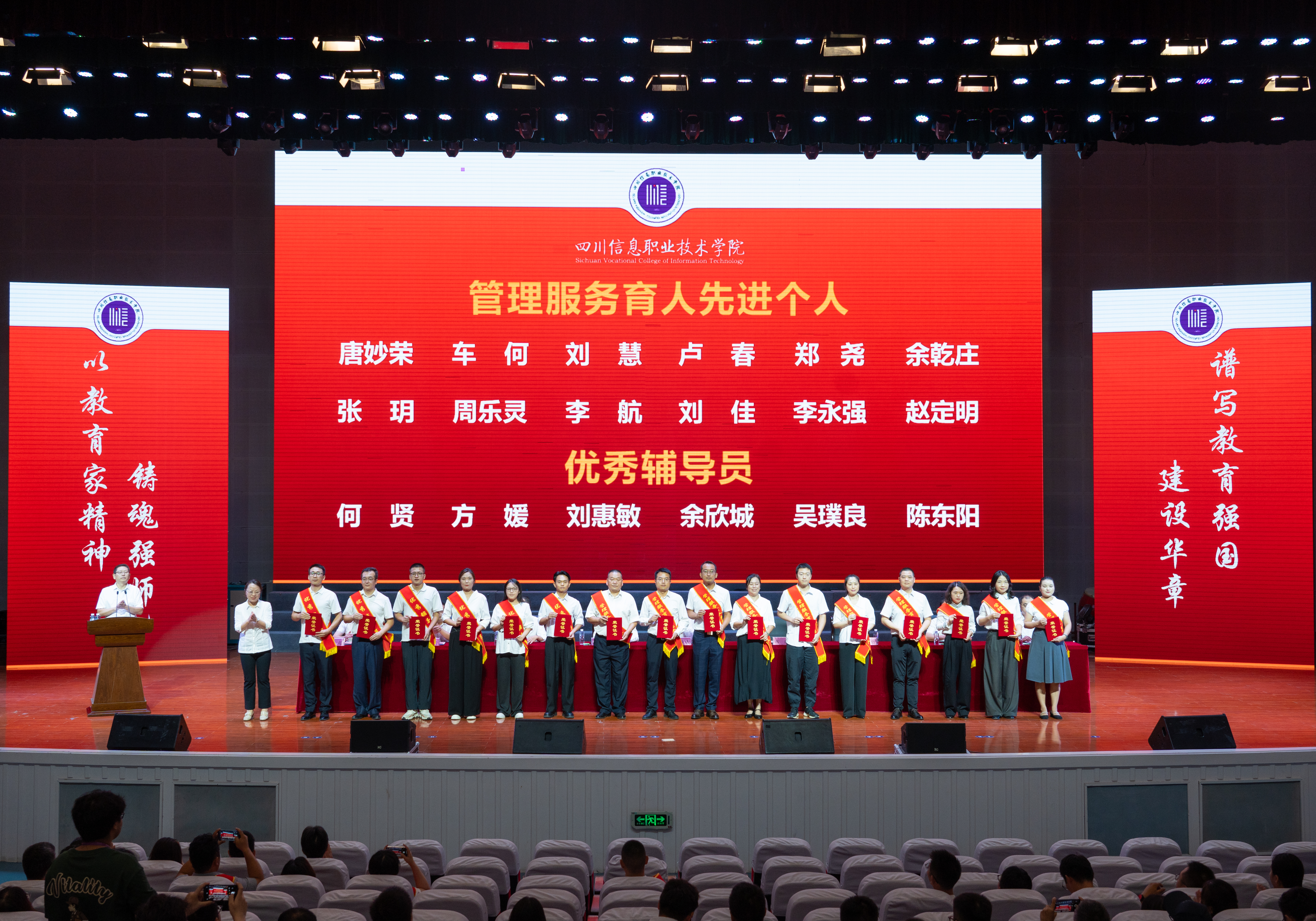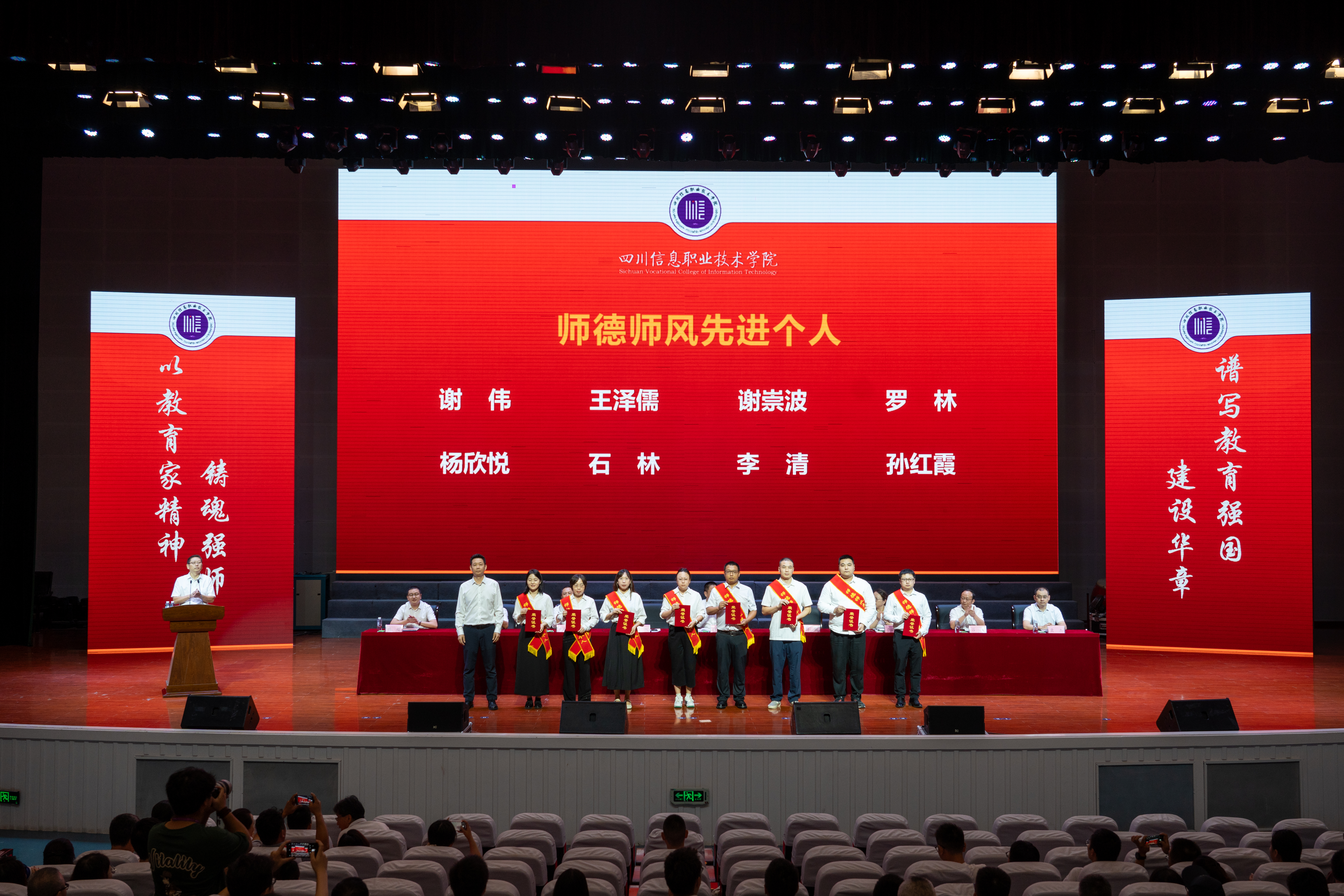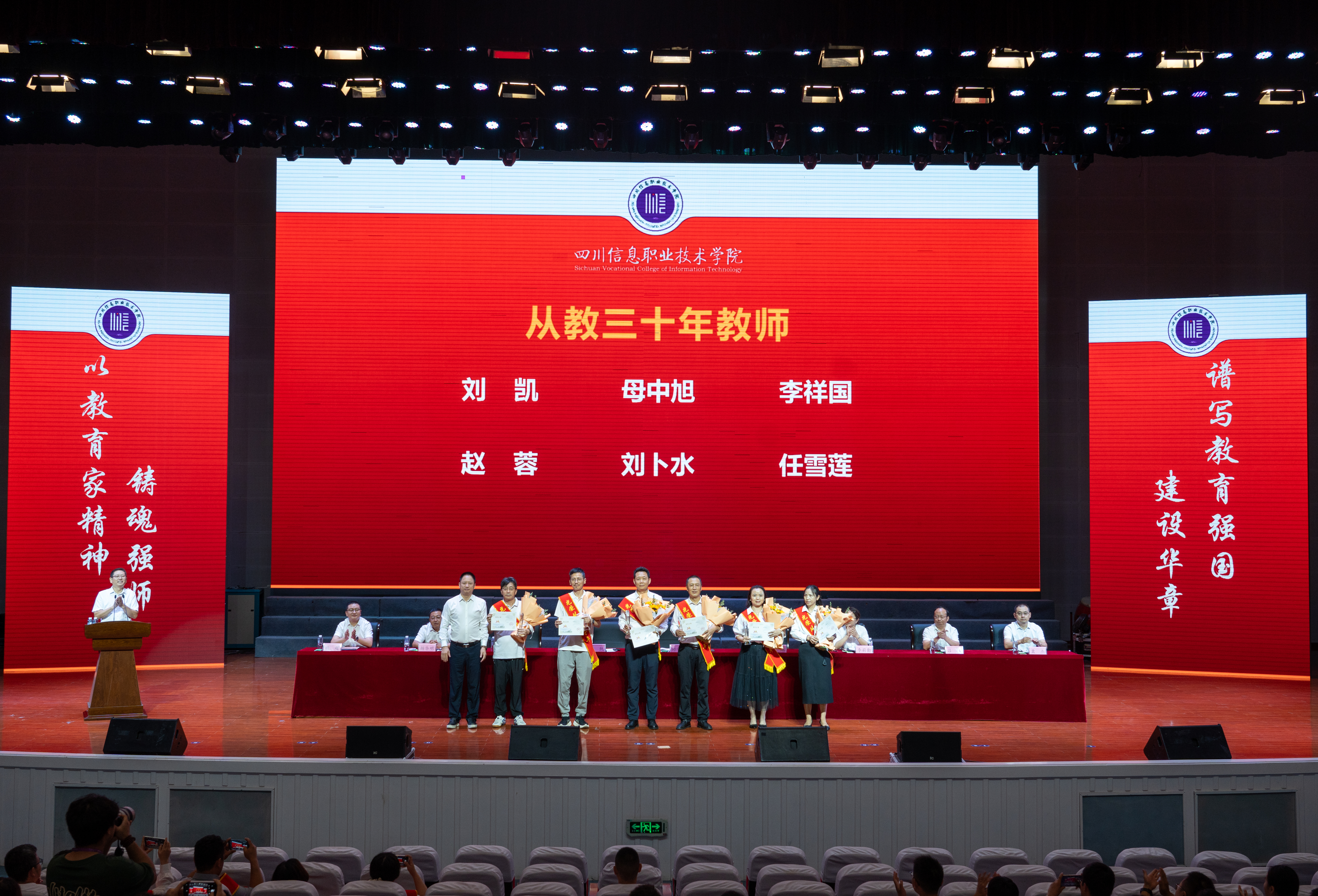 会上,韩鹏宣读了四川省经济和信息化厅教师节慰问信,党委副书记刘凯宣读了2025年教师节表彰文件;与会领导分别为获得2024-2025学年优秀教师、优秀辅导员、管理服务育人先进个人、师德师风先进个人、省级教学创新团队主持人、省级名思政课教师工作室主持人、省级名辅导员工作室主持人、竞赛国家级奖项优秀指导教师、光荣从教三十年教师等荣誉称号的教职员工代表颁发了荣誉证书,优秀教师代表孙红霞分享了教育教学工作中的收获与心得。