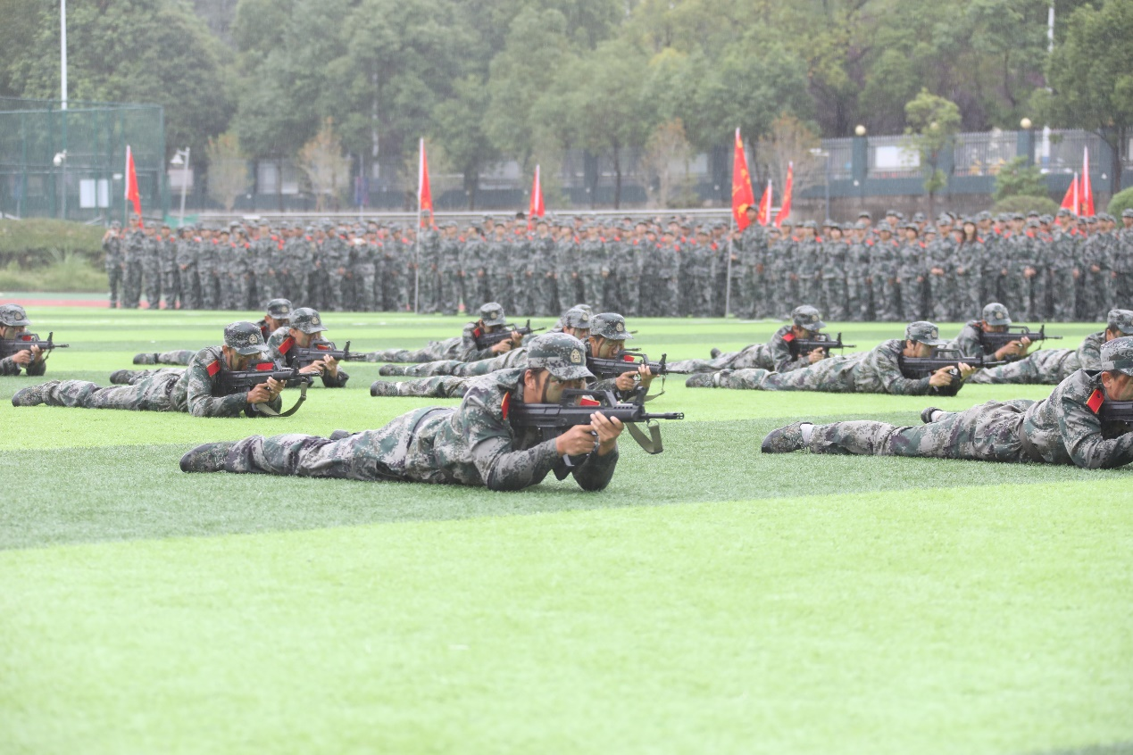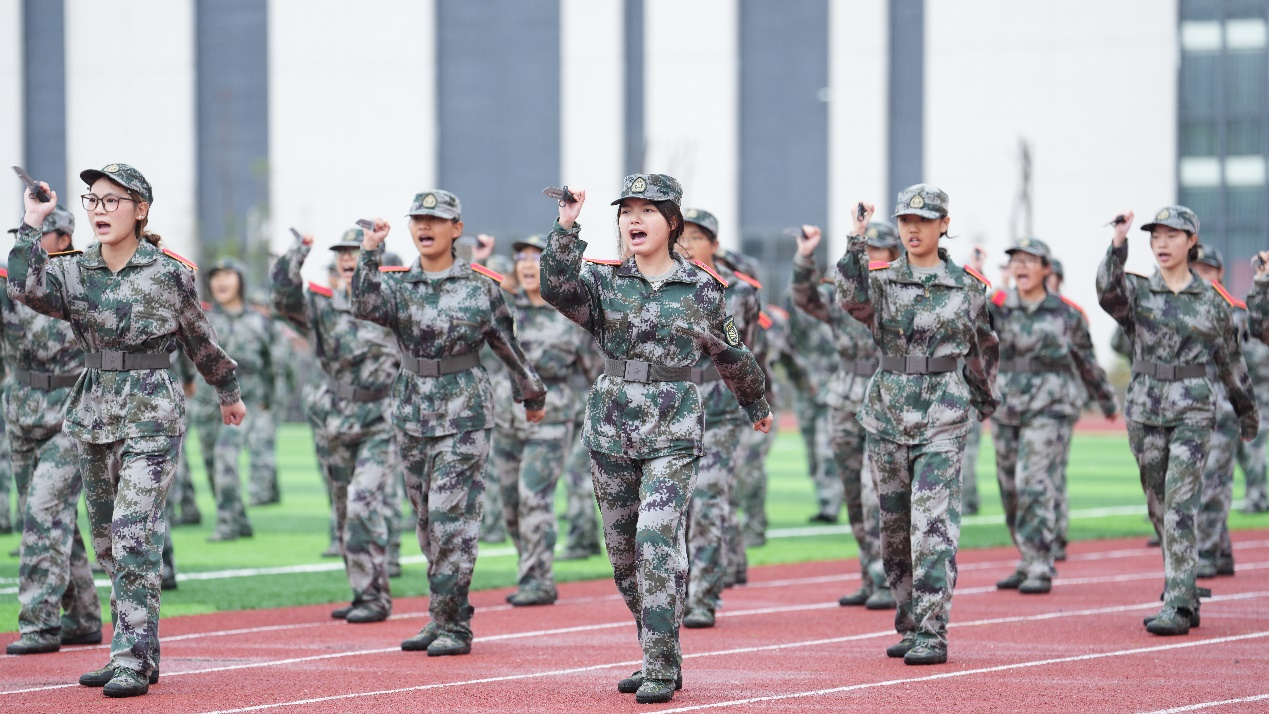 在军训汇报表演环节,新生们进行了队列队形、军体拳、匕首操、战略战术等军训考核科目展示。