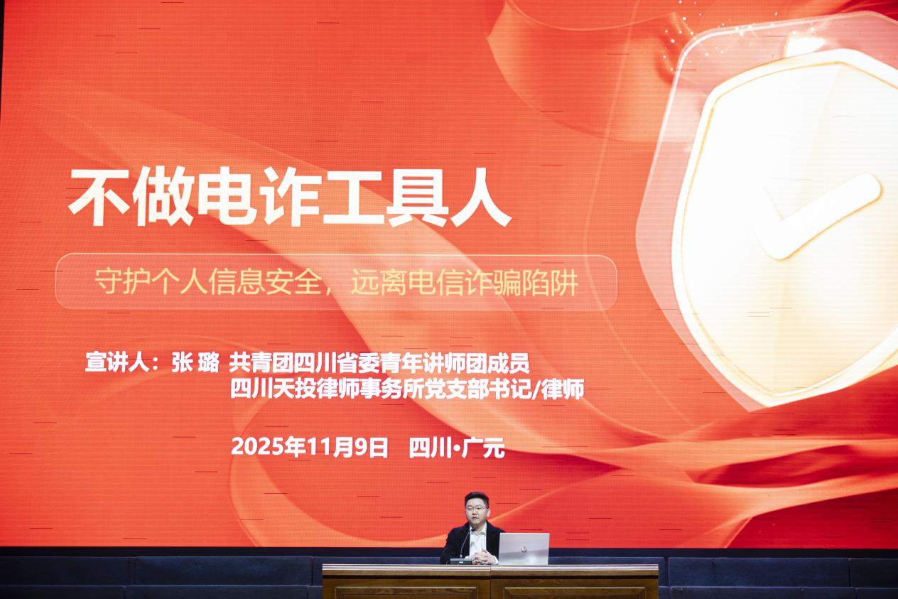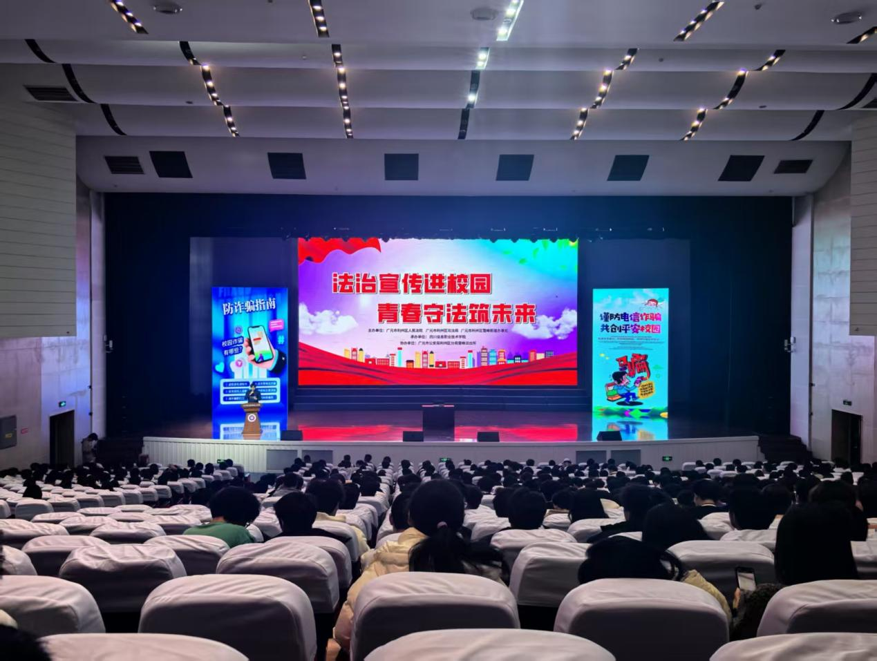 11月9日晚,由市利州区雪峰街道办事处、市利州区人民法院主办,学院保卫处、党委学生工作部承办,电子与物联网学院协办的“法治宣传进校园,青春守法筑未来”法治教育主题活动在雪峰校区学术交流中心演艺厅举行。市利州区雪峰司法所、雪峰派出所、学院党委学生工作部、保卫处等相关人员以及学生代表近千人参加活动。