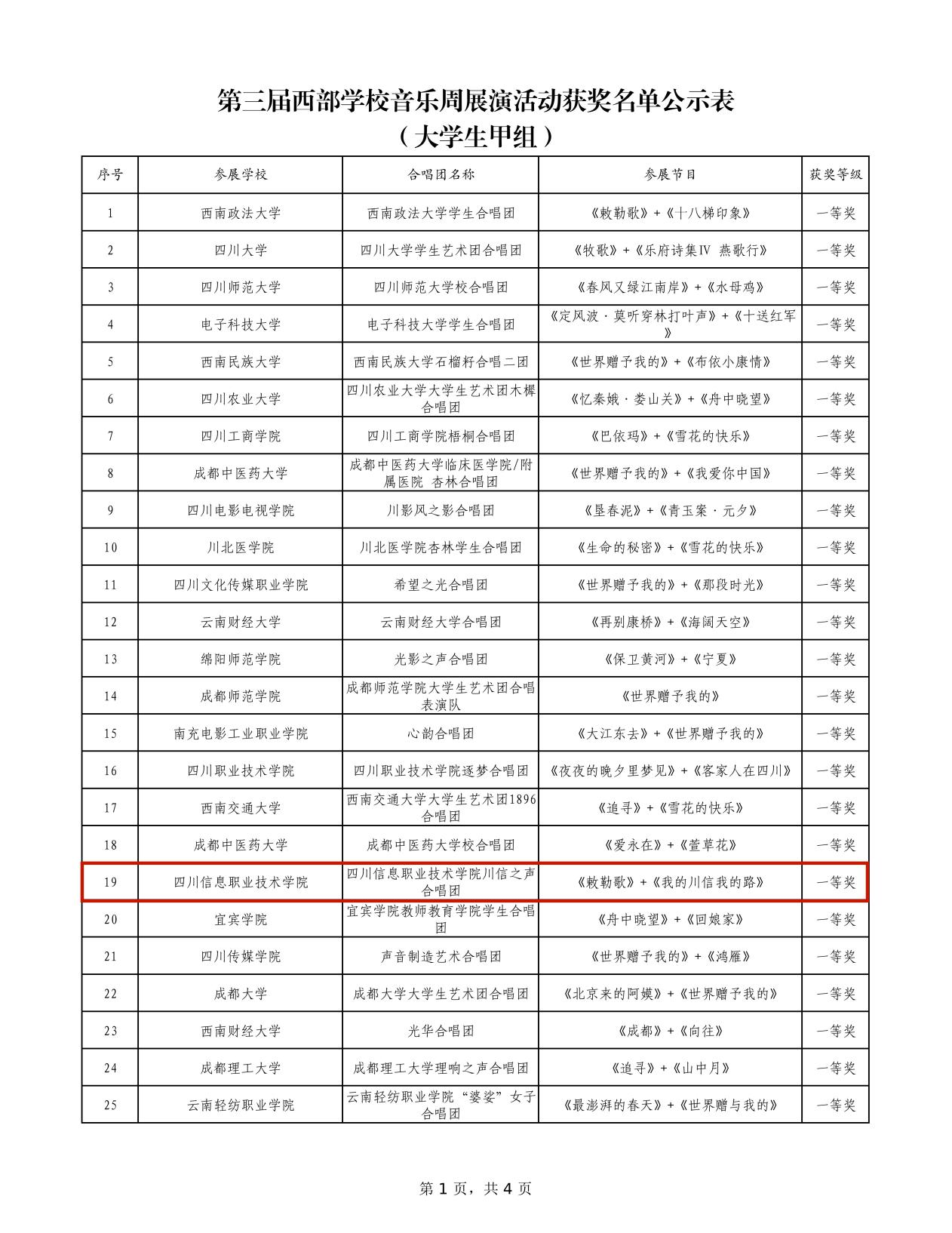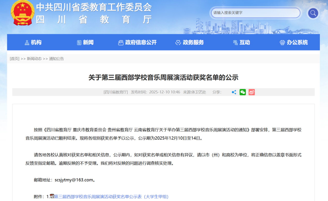 12月10日,四川省教育厅公布了第三届西部学校音乐周展演活动获奖名单。其中,学院大学生艺术团川信之声合唱团的合唱作品《敕勒歌》《我的川信我的路》荣获大学生甲组一等奖。