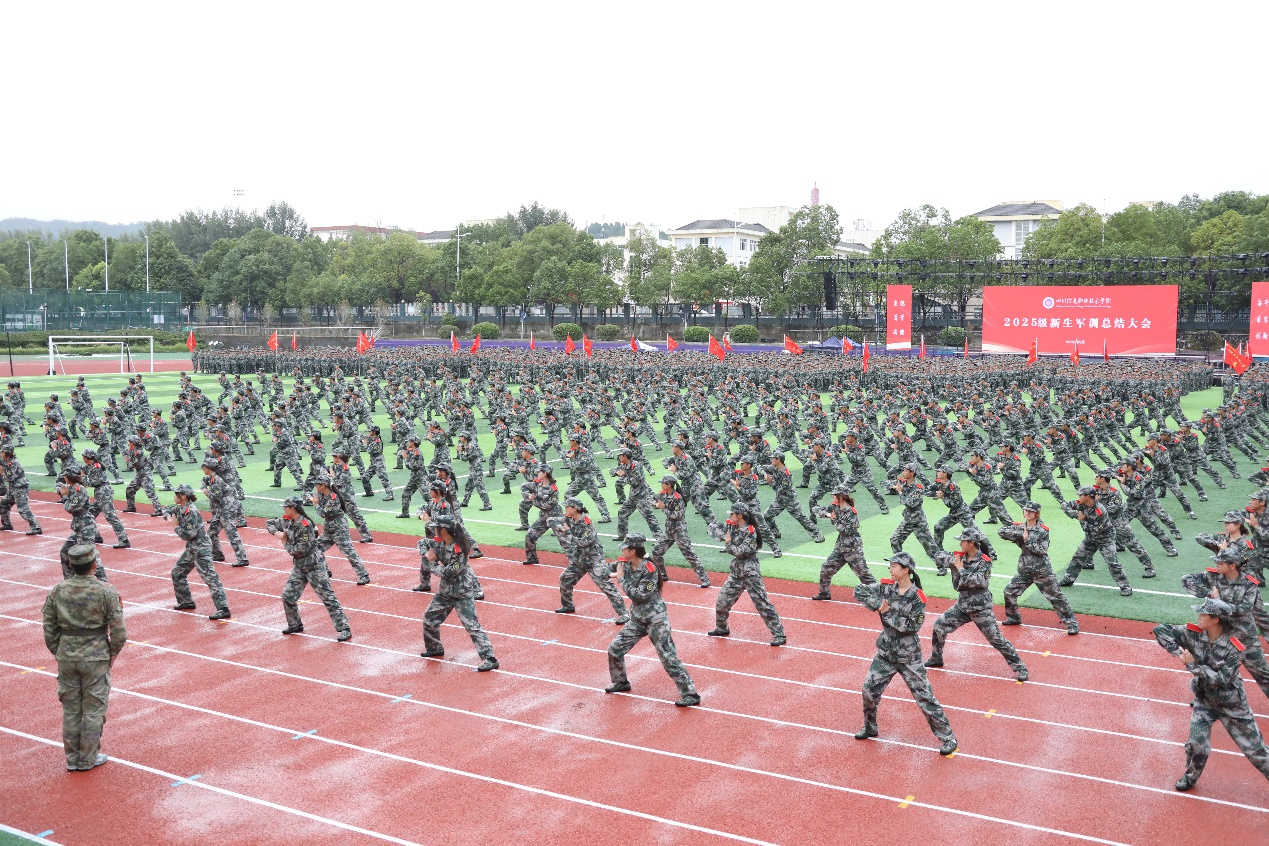 9月28日上午,学院2025级新生军训总结大会在雪峰校区田径场举行。学院党委副书记刘凯及在家院领导班子其他成员,广元市利州区人民武装部政委黄林,广元市教育局相关工作人员,学院职能处室、二级学院主要负责人、承训教官及2025级新生参加大会。会议由学院党委委员、副院长杨华明主持。